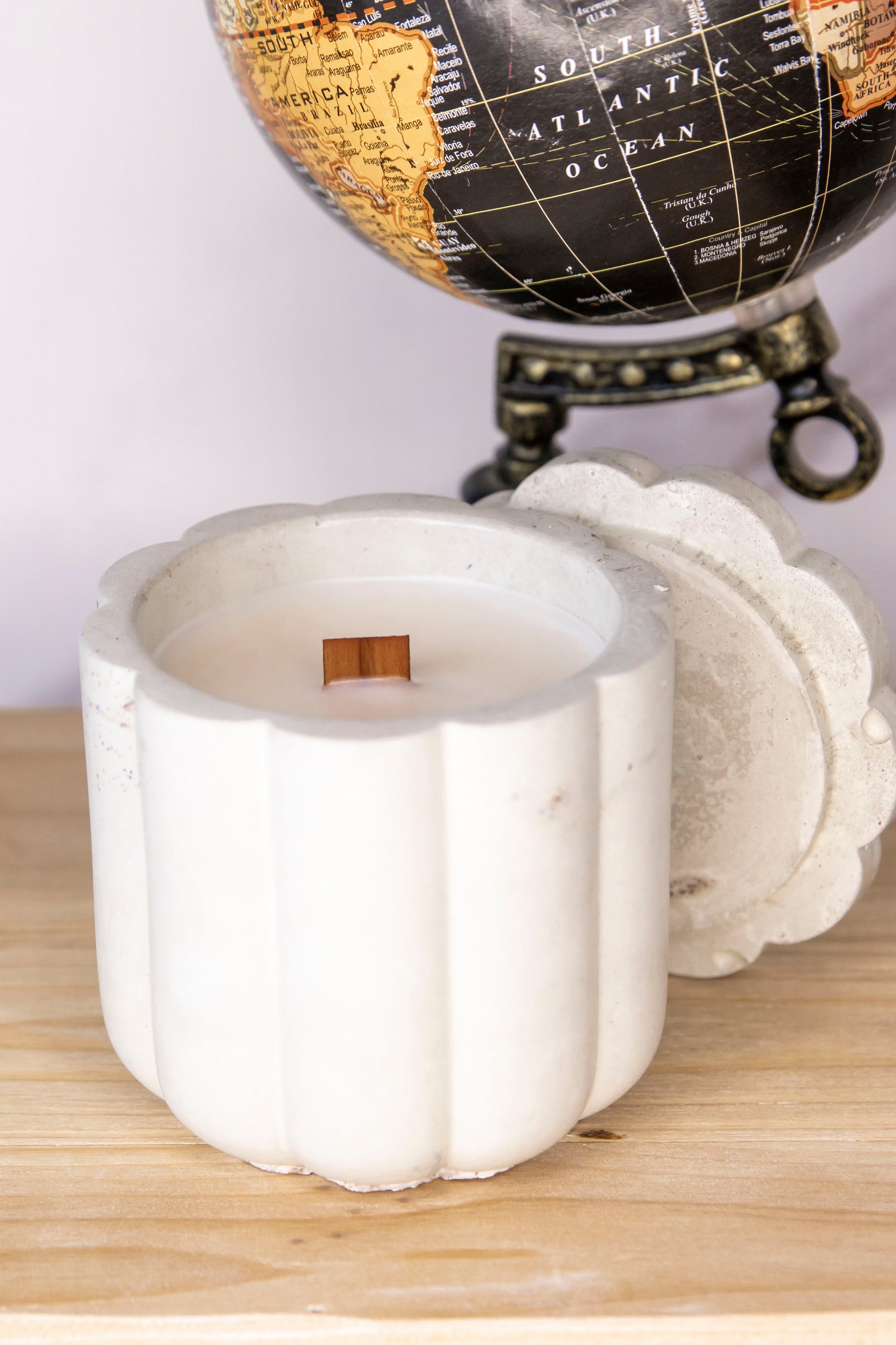 Each concrete jar is handmade by us. They are unique and one-of-a-kind. The concrete jars are sealed with a non-toxic, water-based protective sealant to prevent seepage of the wax and fragrance oil.