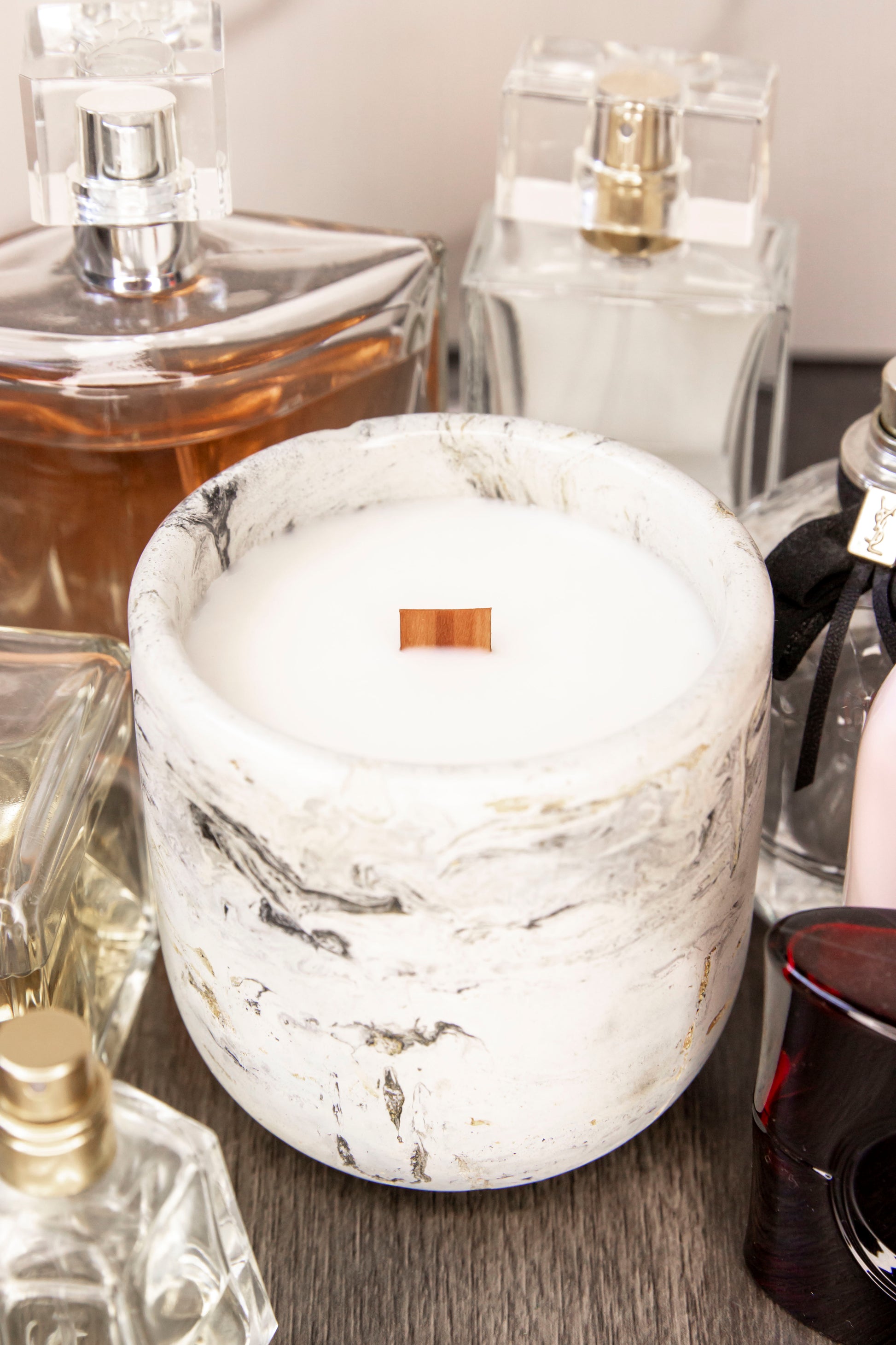 Each concrete jar is handmade by us. They are unique and one-of-a-kind. The concrete jars are sealed with a non-toxic, water-based protective sealant to prevent seepage of the wax and fragrance oil.