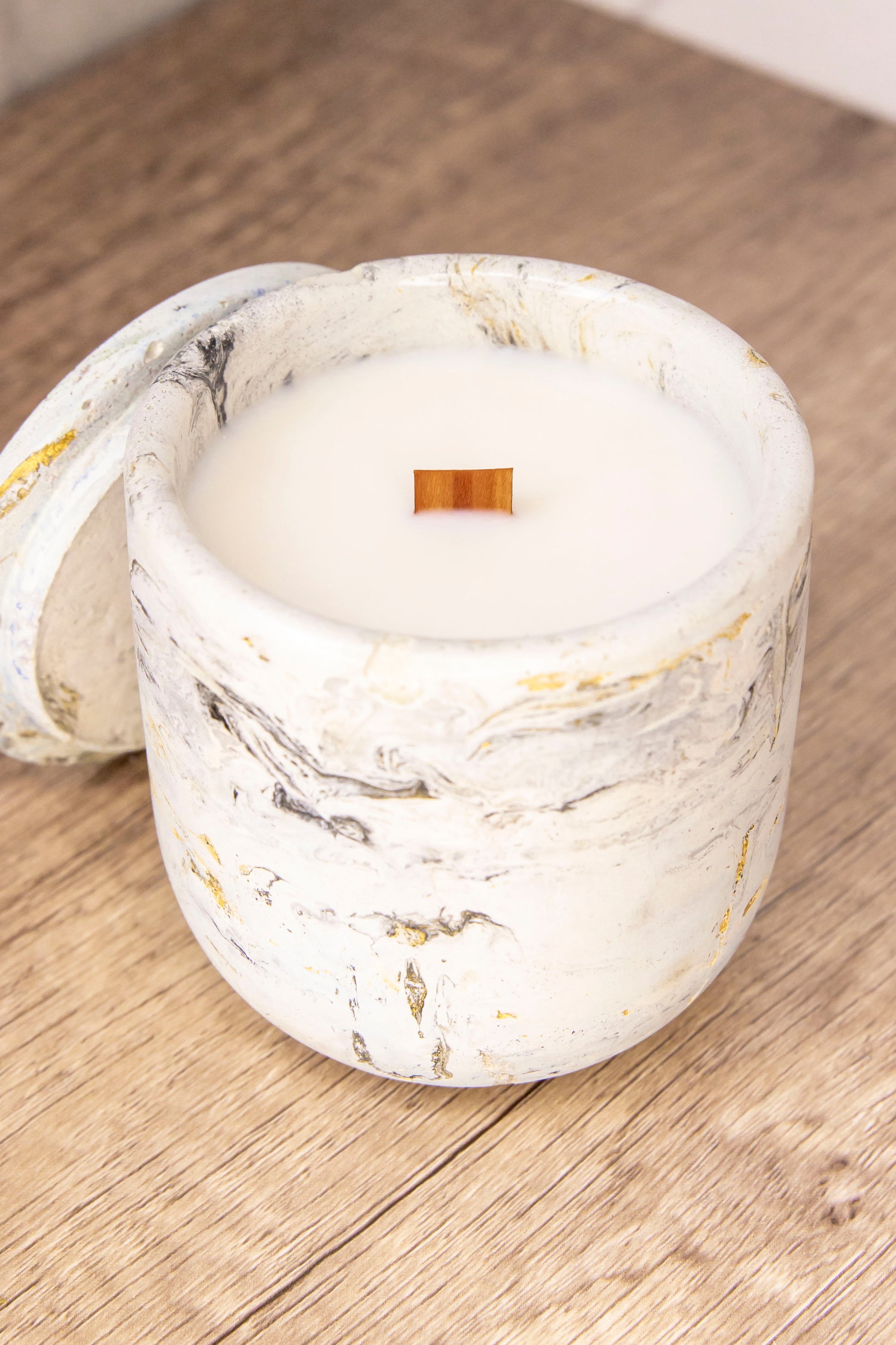 Each concrete jar is handmade by us. They are unique and one-of-a-kind. The concrete jars are sealed with a non-toxic, water-based protective sealant to prevent seepage of the wax and fragrance oil.