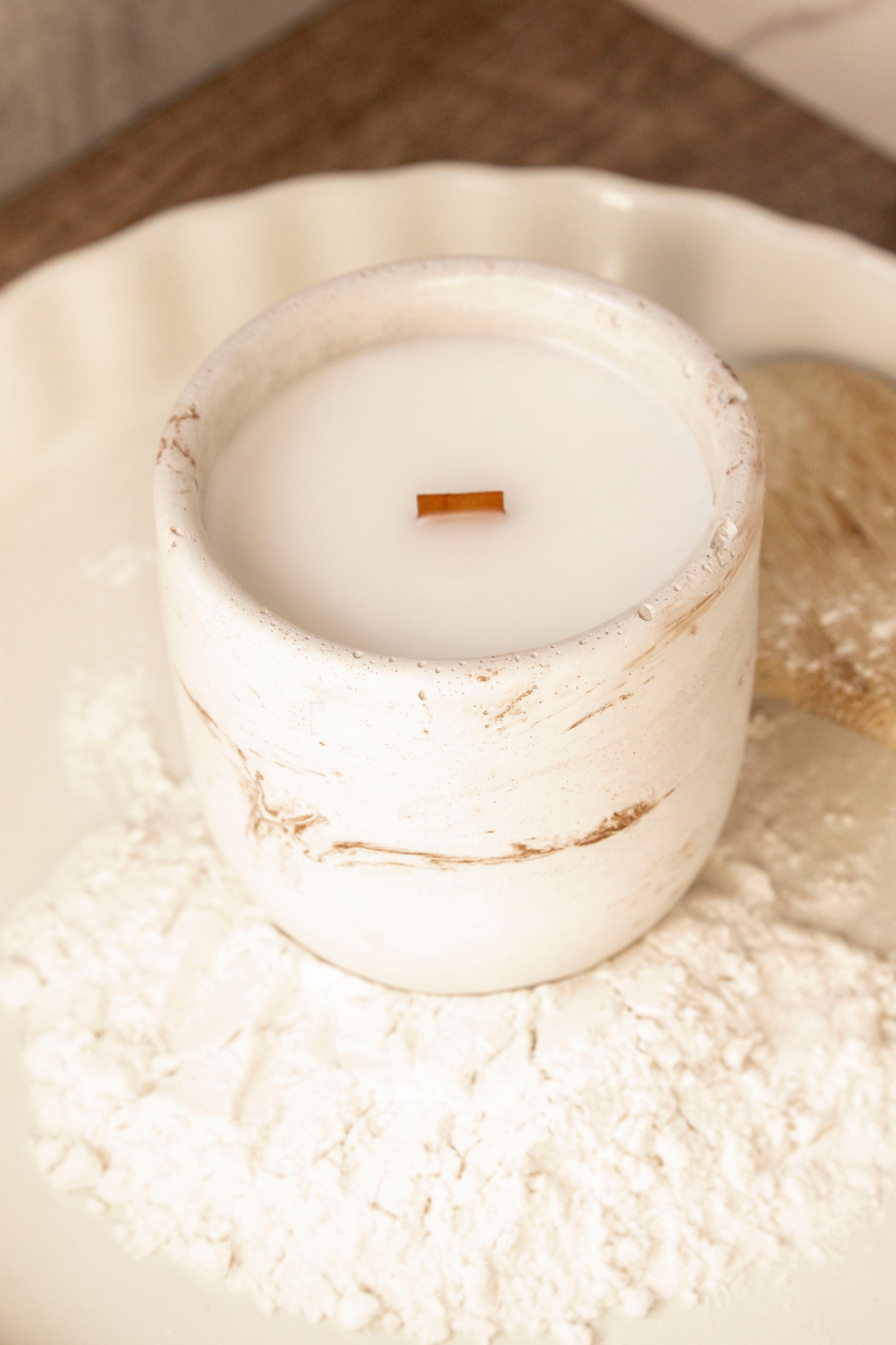 Each concrete jar is handmade by us. They are unique and one-of-a-kind. The concrete jars are sealed with a non-toxic, water-based protective sealant to prevent seepage of the wax and fragrance oil.