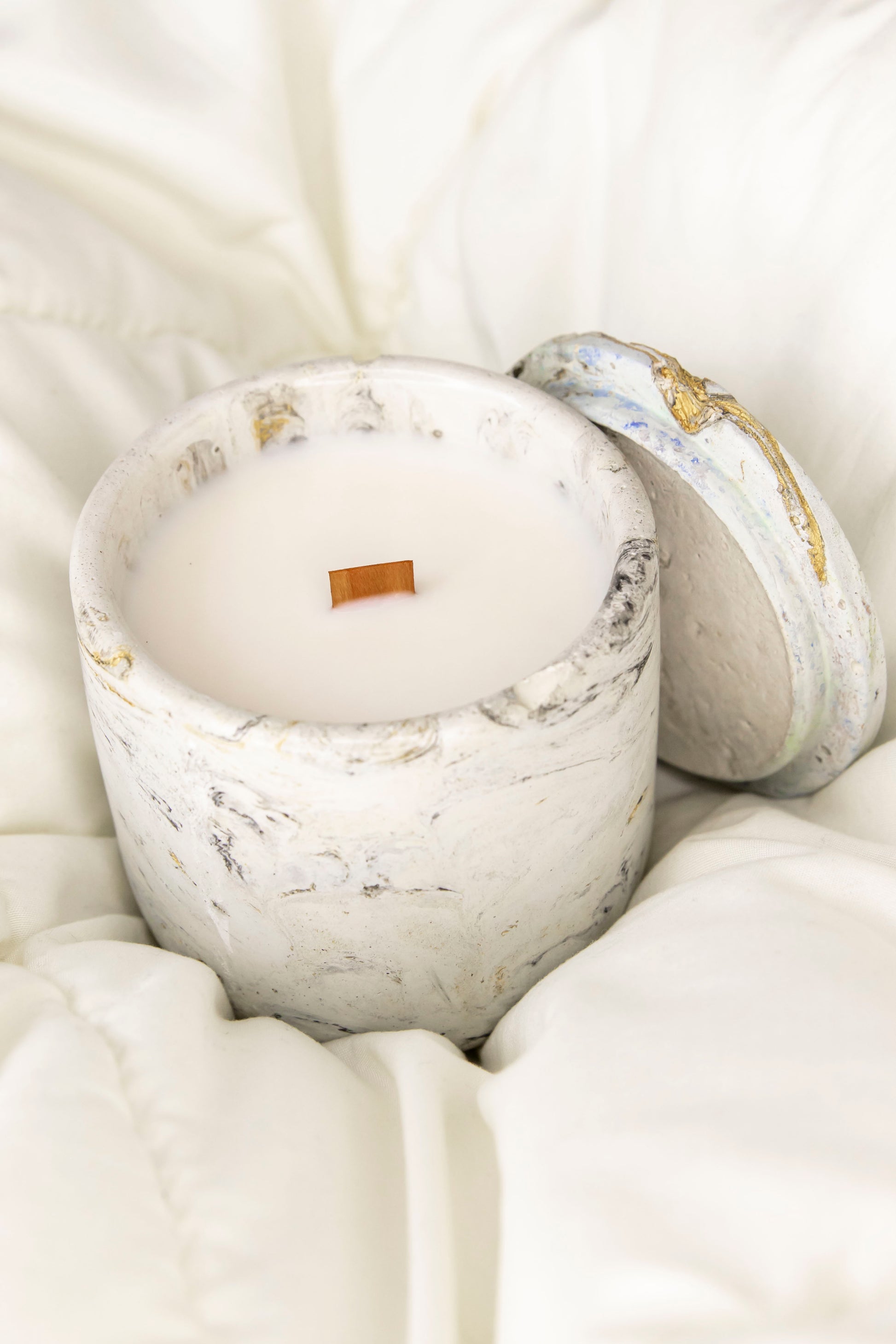 Each concrete jar is handmade by us. They are unique and one-of-a-kind. The concrete jars are sealed with a non-toxic, water-based protective sealant to prevent seepage of the wax and fragrance oil.