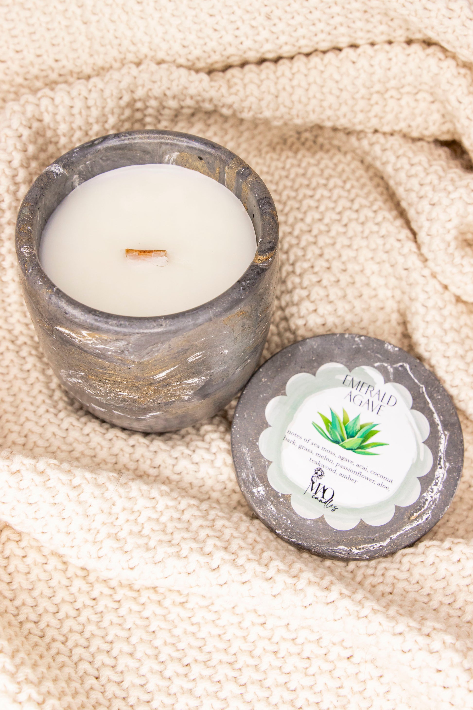 Each concrete jar is handmade by us. They are unique and one-of-a-kind. The concrete jars are sealed with a non-toxic, water-based protective sealant to prevent seepage of the wax and fragrance oil.