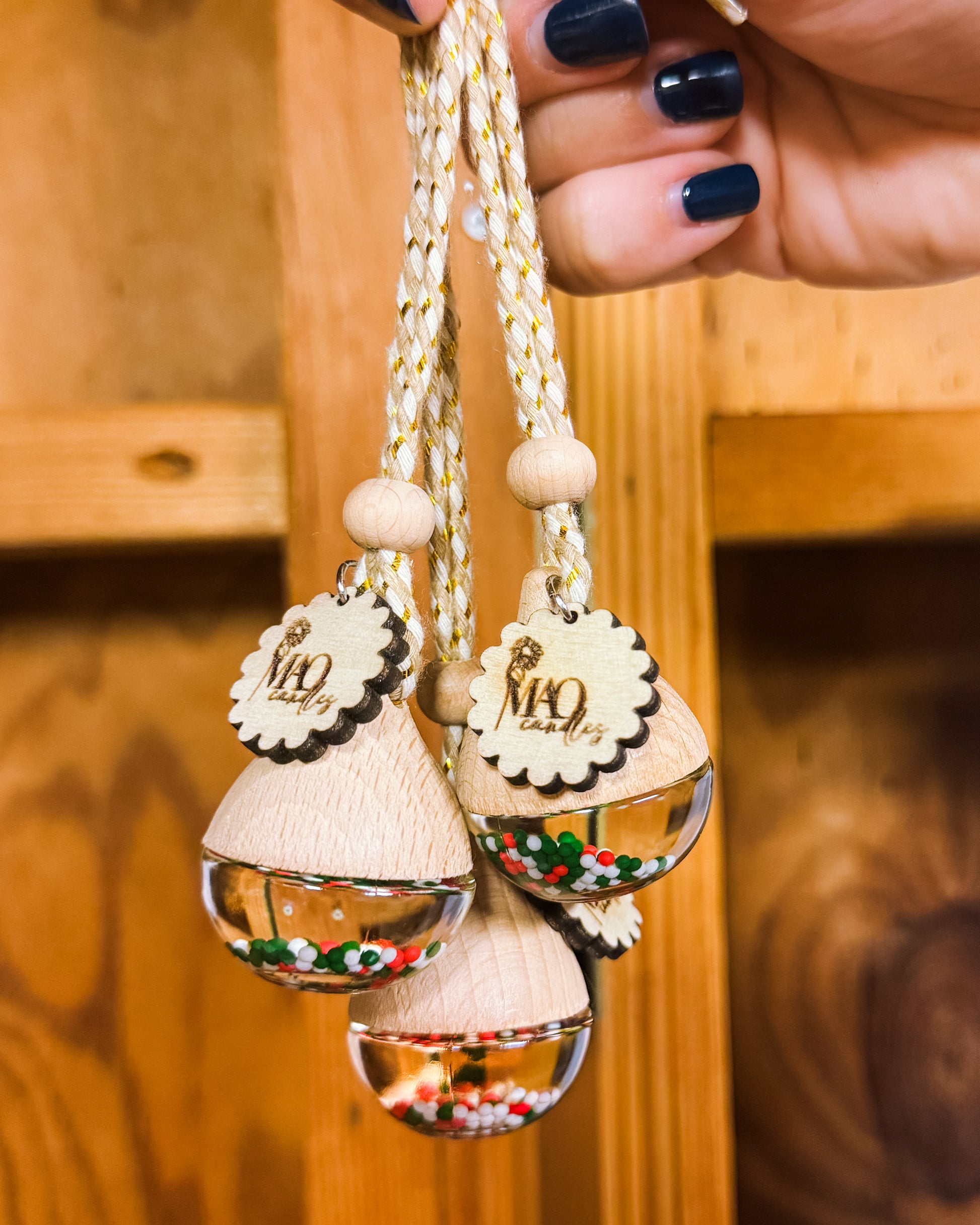 Our car diffusers last about 2 months, dependent on weather, before requiring a refill! Each diffuser features a glass container, Christmas colored beads, wooden top, adjustable strap, and wooden bead.