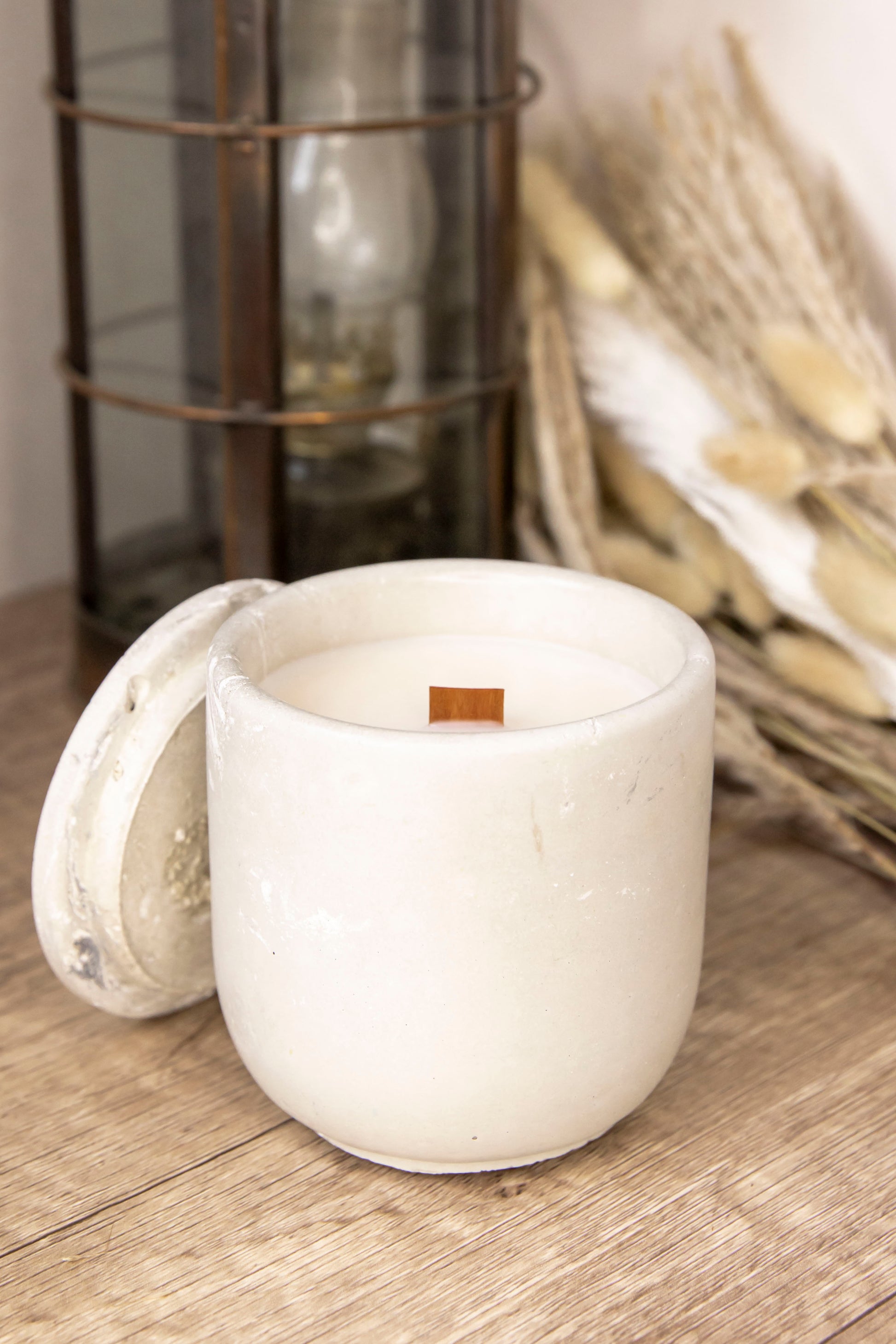 Each concrete jar is handmade by us. They are unique and one-of-a-kind. The concrete jars are sealed with a non-toxic, water-based protective sealant to prevent seepage of the wax and fragrance oil.