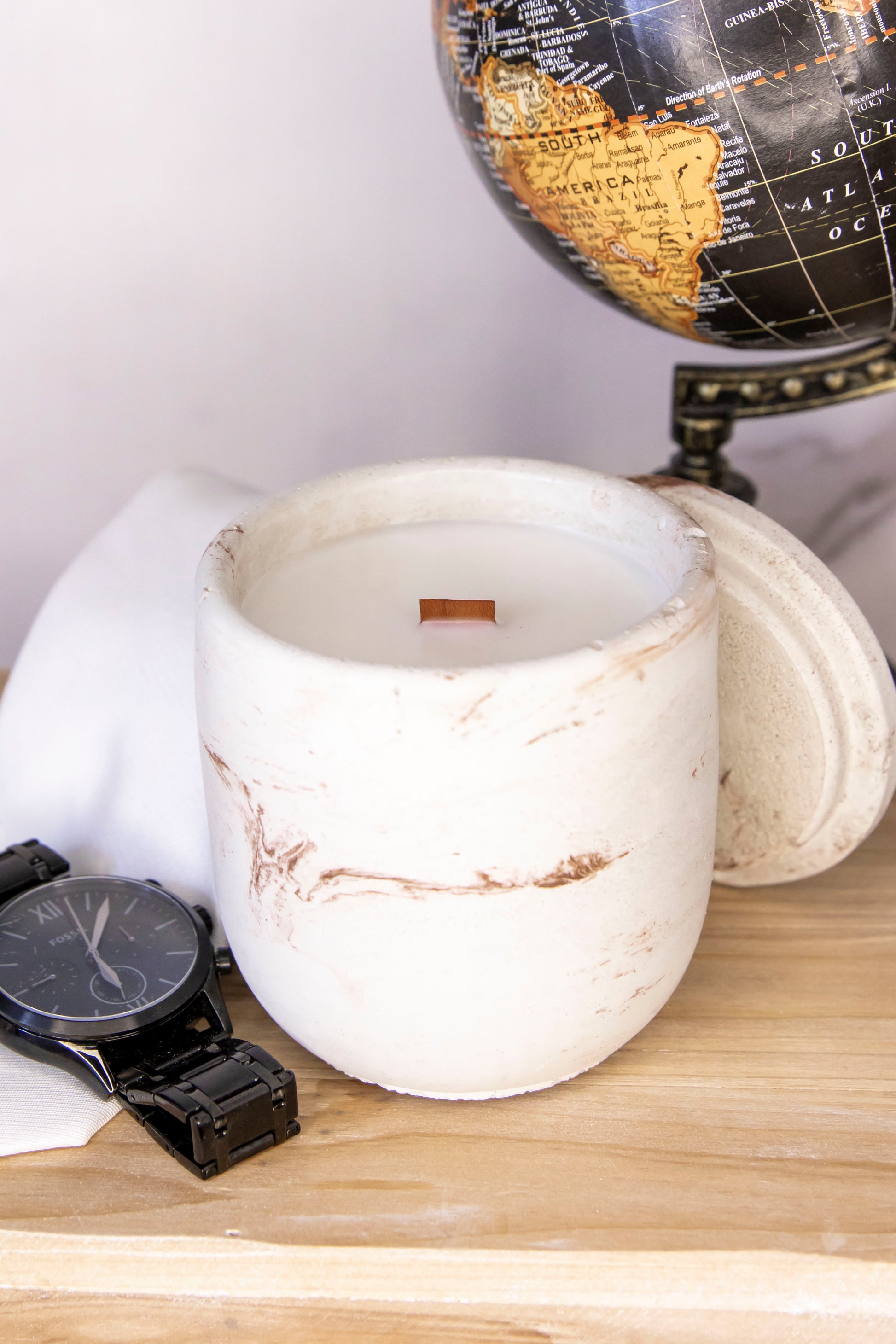 Each concrete jar is handmade by us. They are unique and one-of-a-kind. The concrete jars are sealed with a non-toxic, water-based protective sealant to prevent seepage of the wax and fragrance oil.