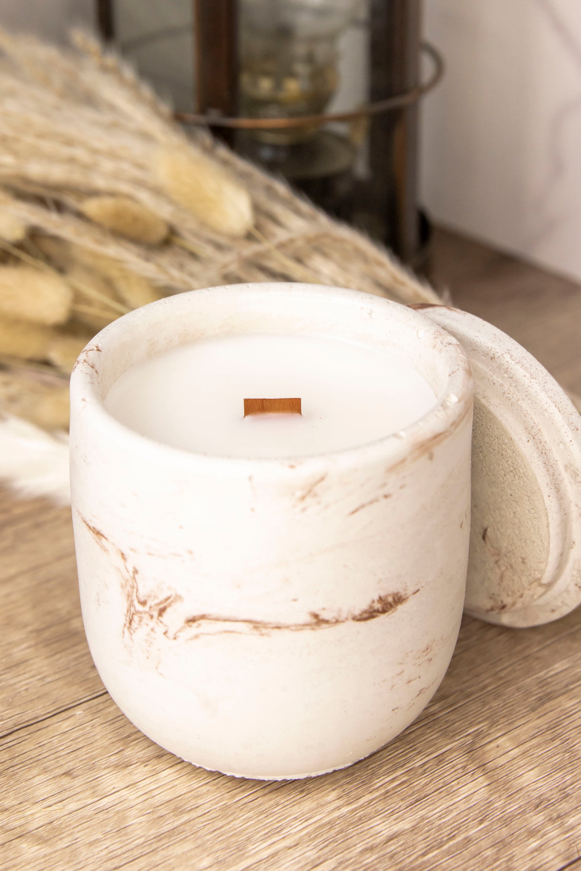 Each concrete jar is handmade by us. They are unique and one-of-a-kind. The concrete jars are sealed with a non-toxic, water-based protective sealant to prevent seepage of the wax and fragrance oil.