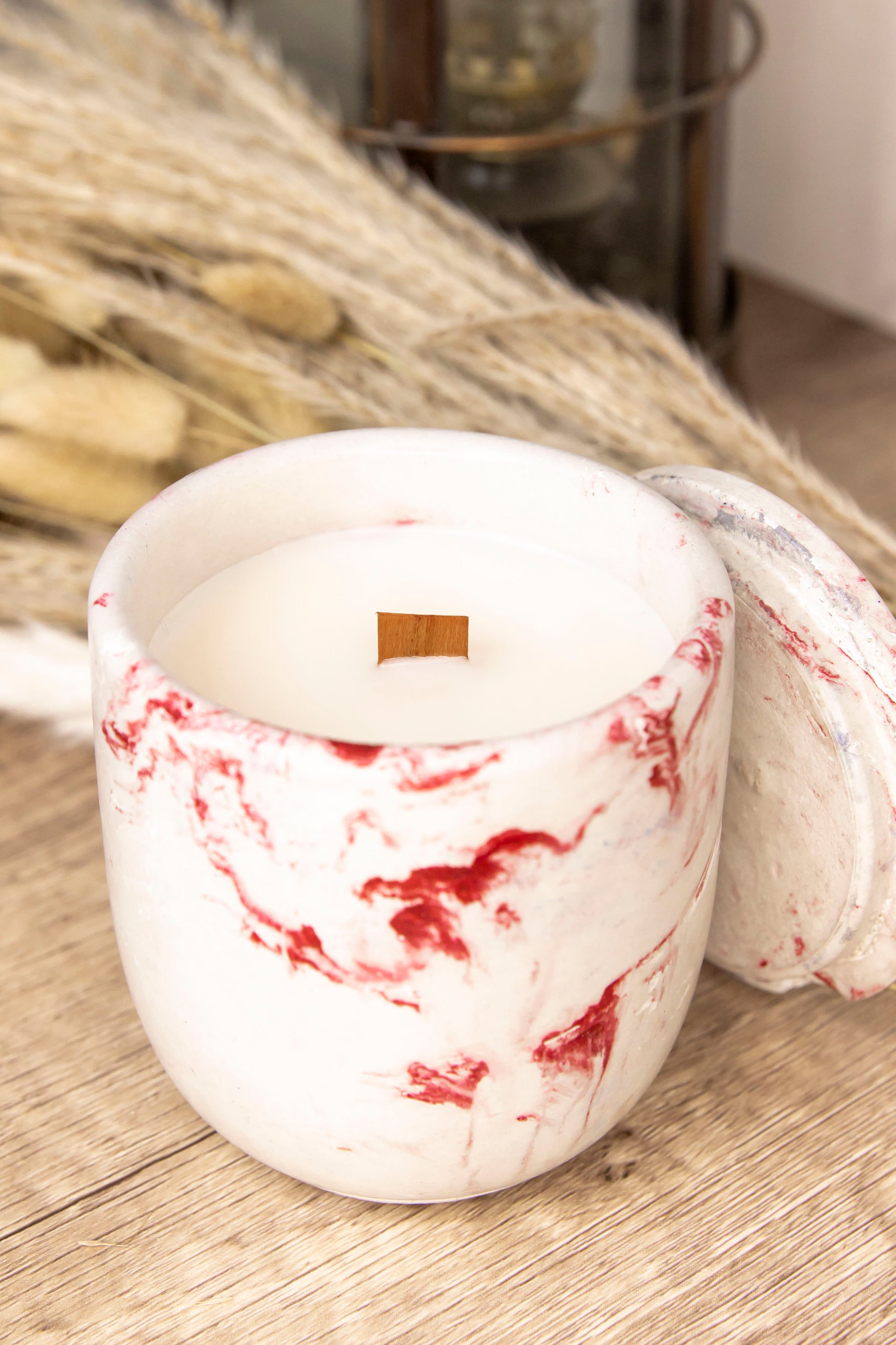 Each concrete jar is handmade by us. They are unique and one-of-a-kind. The concrete jars are sealed with a non-toxic, water-based protective sealant to prevent seepage of the wax and fragrance oil.